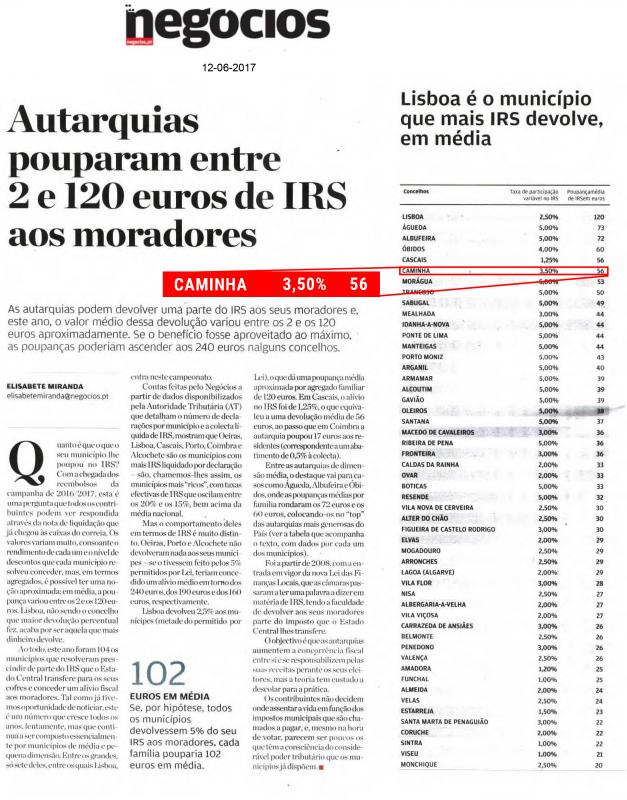 Os dados estão publicados na edição de ontem daquele jornal especializado em assuntos económicos e financeiros, ocupando este tema as páginas 10 e 11, onde se destaca, na primeira, o quadro que elenca os concelhos por ordem decrescente, tendo em conta a taxa de participação variável no IRS e a poupança média de IRS em euros. Caminha aparece em sexto lugar entre todos os municípios do país, sendo que este ano foram 104 os municípios que resolveram prescindir de parte do IRS que o Estado Central transfere para os seus cofres e conceder um alívio fiscal aos munícipes.
