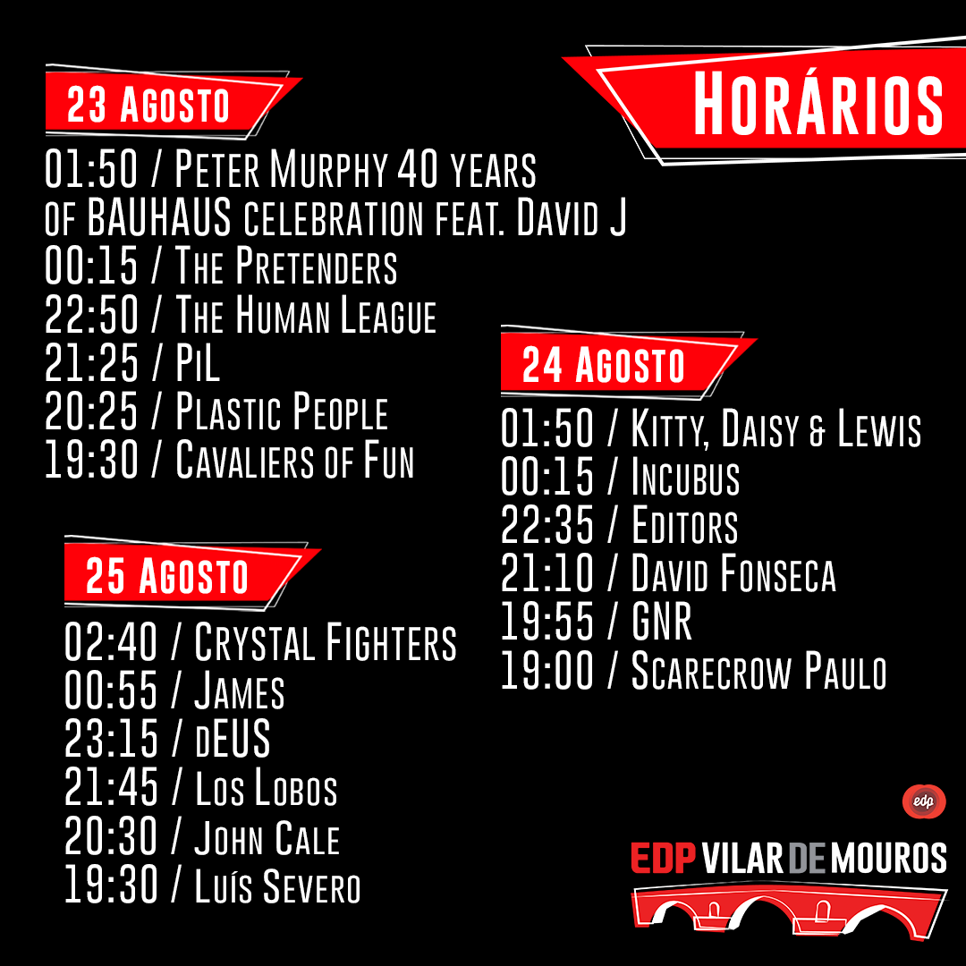 A organização do festival EDP Vilar de Mouros, acaba de revelar os horários dos concertos das 18 bandas que vão atuar no emblemático festival português, o mais antigo da península ibérica. O festival EDP Vilar de Mouros realiza-se nos dias 23, 24 e 25 de agosto e promete agitar a mítica freguesia do concelho de Caminha.