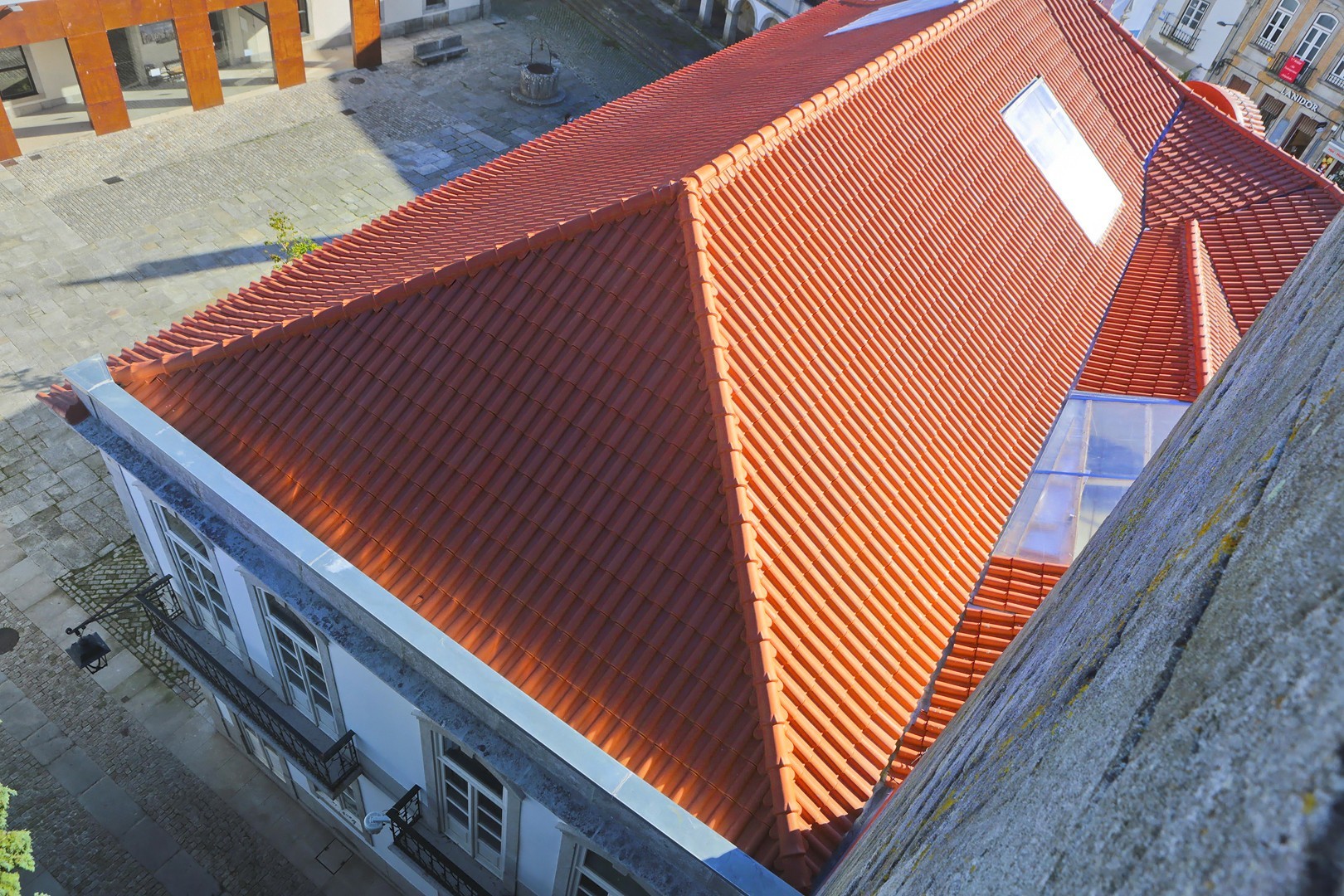 Relativamente ao do telhado do edifício Paços do Concelho, foi substituída toda a telha cerâmica, bem como foram requalificados os beirados existentes. A estrutura de suporte em madeira foi também intervencionada. Aqui foram substituídos os elementos que se apresentavam em avançado estado de degradação, quer os elementos estruturais quer o forro de madeira. Sob a telha cerâmica foi aplicada uma tela com caraterísticas térmicas, bem como foram substituídos todos os rufos existentes, que se apresentavam também em avançado estado de degradação e com ligações que não garantiam a sua estanquidade, originando infiltrações através dos mesmos. Os trabalhos incluíram a requalificação das claraboias existentes.