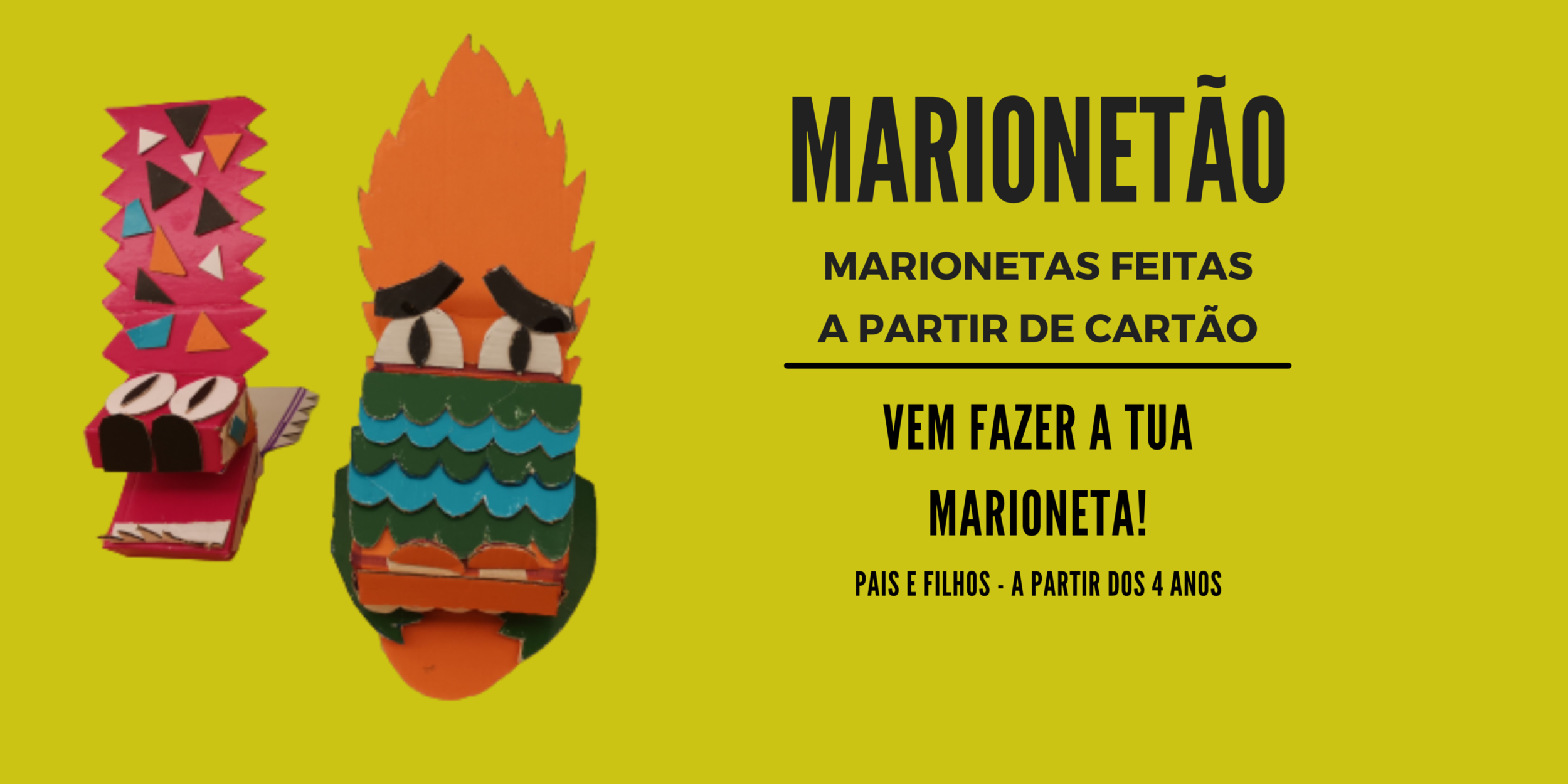 As marionetas podem ser criadas das mais variadas formas e técnicas. Esta é uma oficina de marionetas feitas a partir de cartão. Aqui transformam-se simples bocados de cartão, que já ninguém usa, em personagens diversas, capazes de contar histórias incríveis. Mãos à obra, vamos criar!