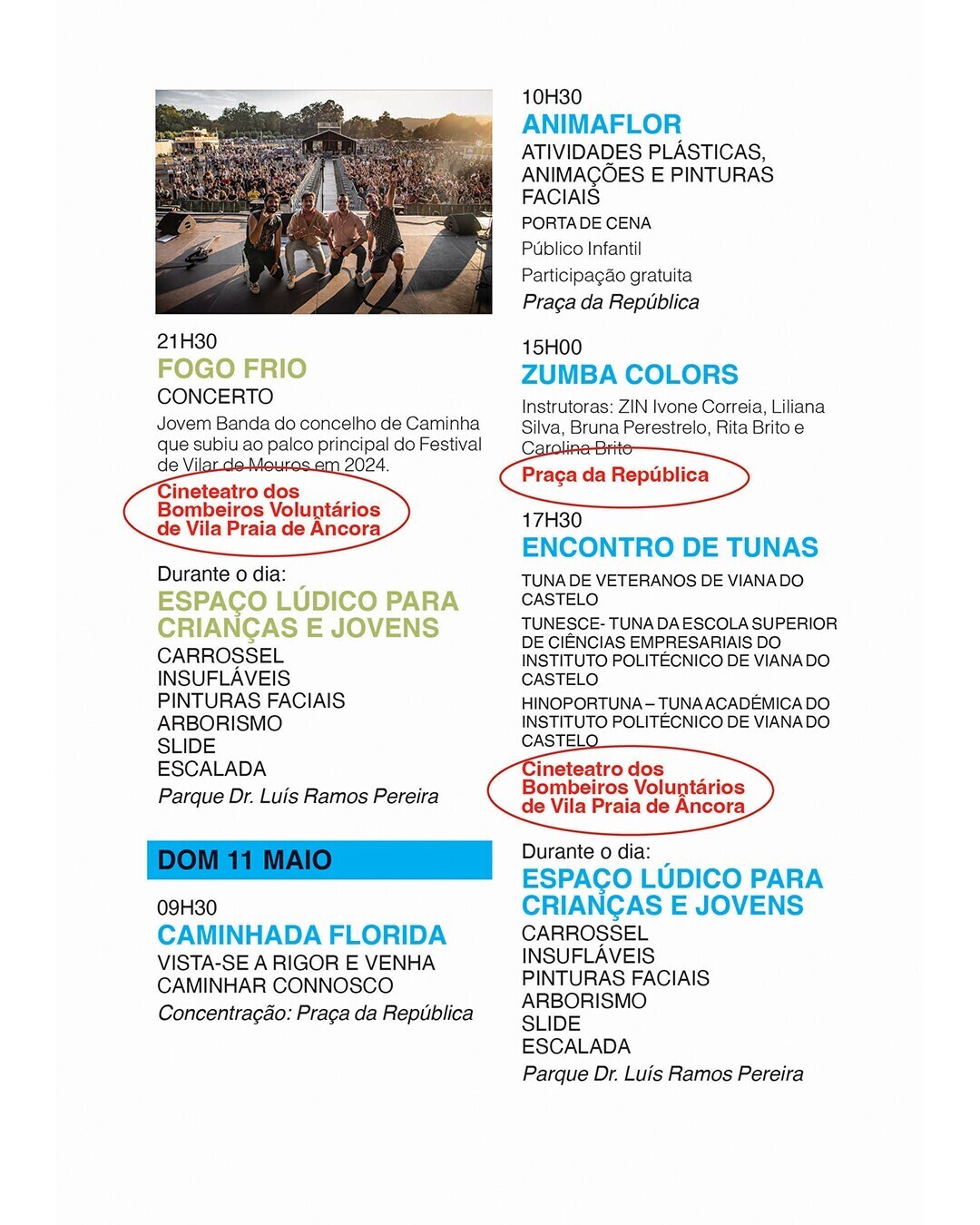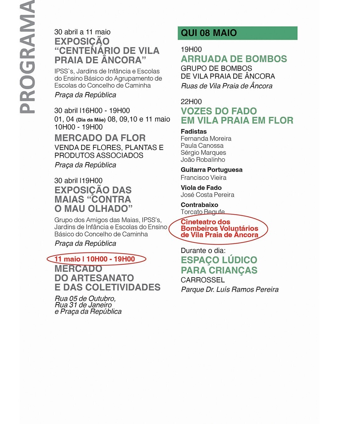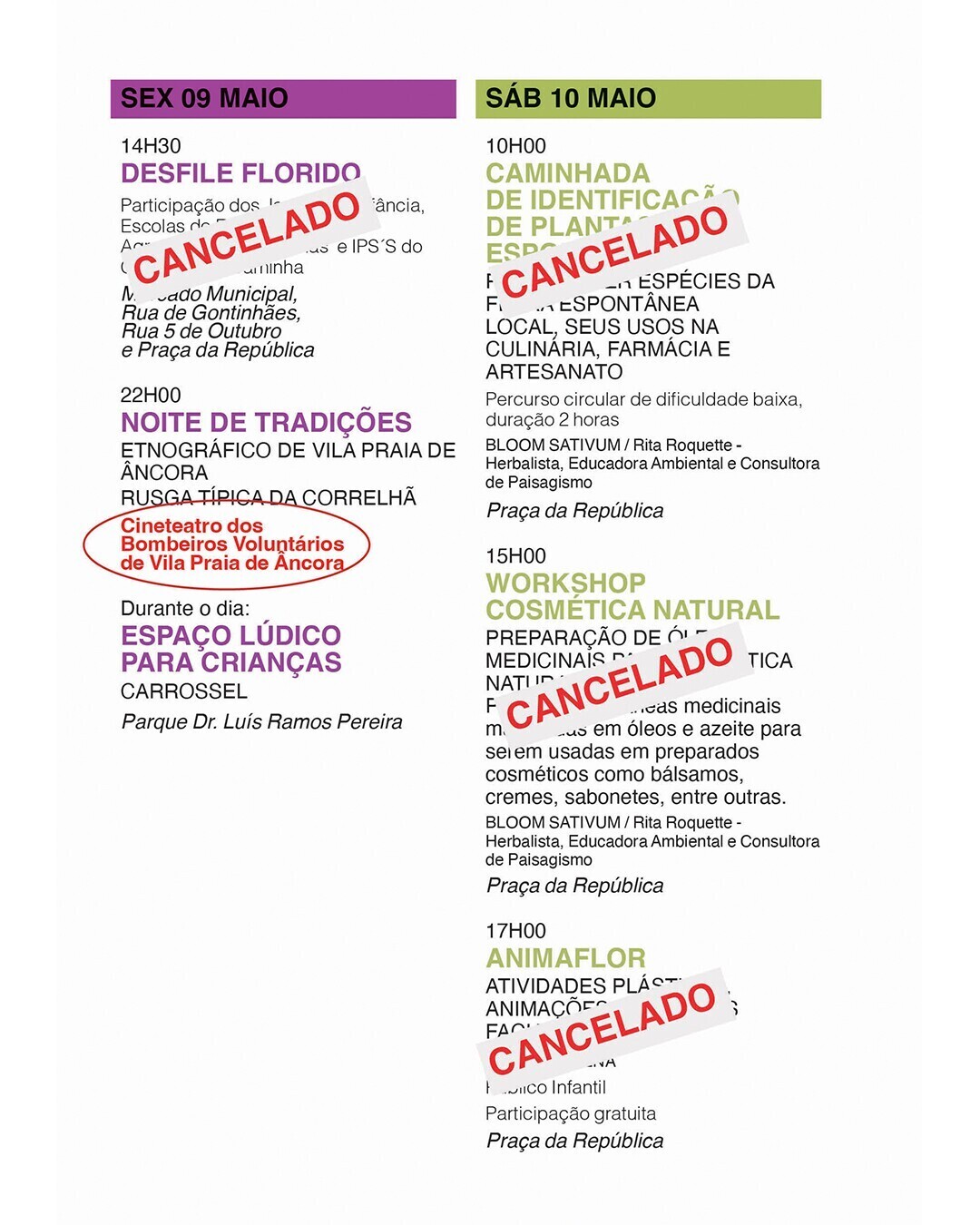 Todos os espetáculos agendados para a Praça da República são transferidos para o Cineteatro dos Bombeiros Voluntários de Vila Praia de Âncora, mantendo-se os horários;