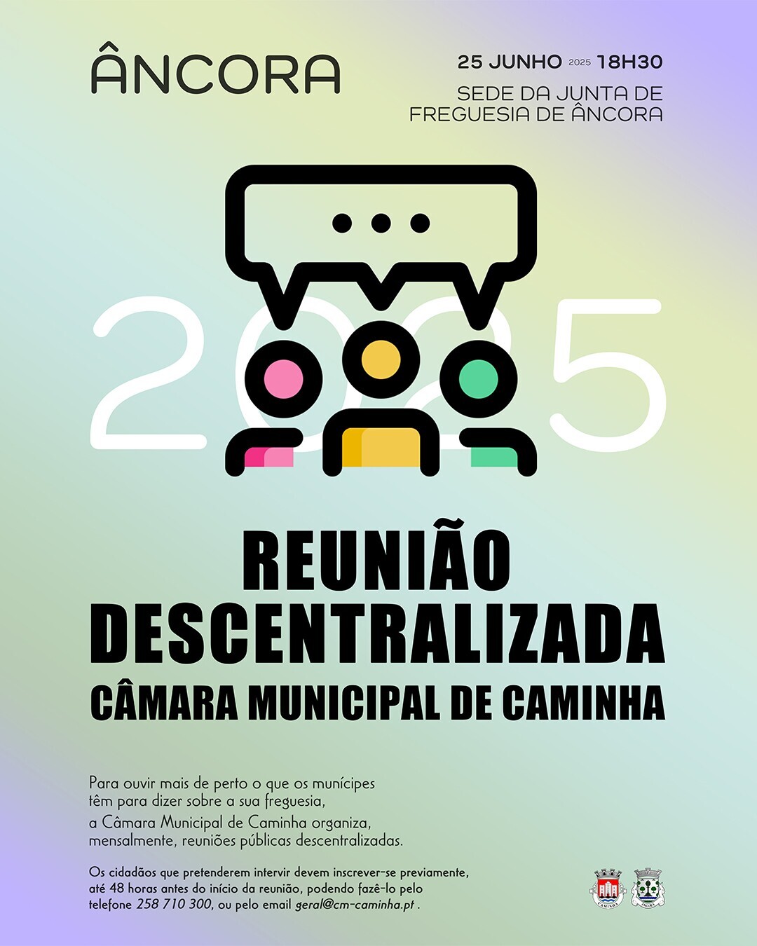 Os cidadãos interessados em participar, podem fazer a respetiva inscrição através do telefone 258 710300, ou por email: geral@cm-caminha.pt até 48 horas antes da data reunião.