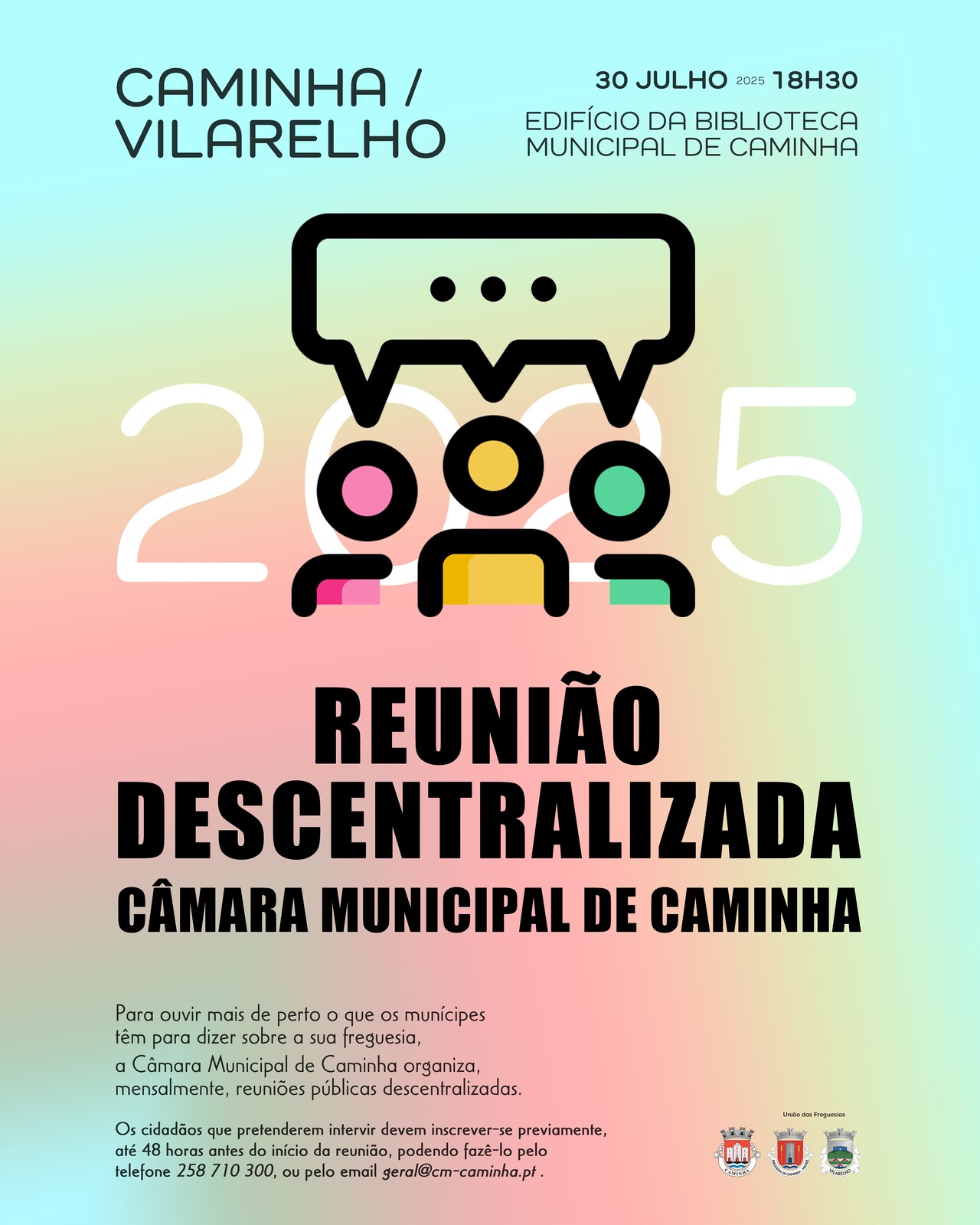 Os cidadãos interessados em participar, podem fazer a respetiva inscrição através do telefone 258 710300, ou por email: geral@cm-caminha.pt até 48 horas antes da data reunião.