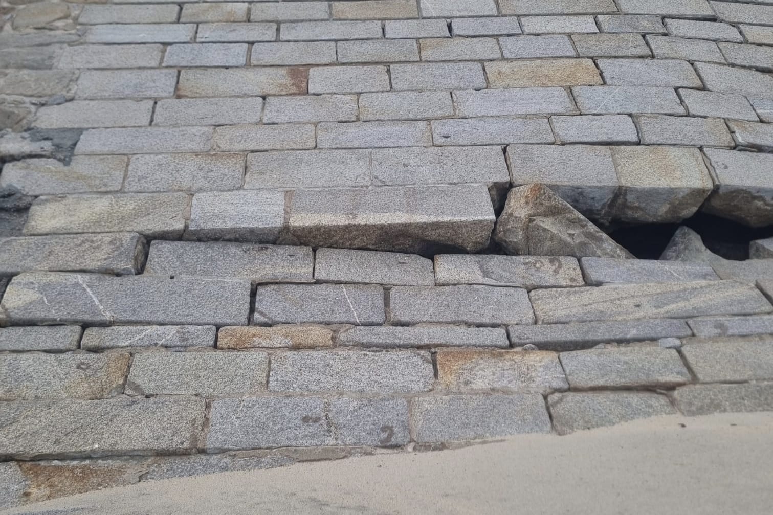 O paredão não derrocou totalmente graças à intervenção de emergência realizada no passado mês. No entanto, a intensidade e progressão do mar voltaram a provocar danos relevantes, colocando atualmente esta infraestrutura em risco efetivo de colapso.