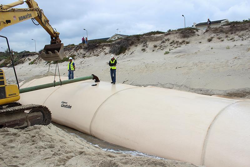 \r\nA tecnologia e os materiais que estão a ser usados são holandeses e baseiam-se na utilização de areia e água do mar para resolver os problemas de erosão que há alguns anos afetam a praia e que foram agravados pelas intempéries do último inverno. A intervenção envolve a colocação de "geotubes", neste caso onze módulos, cada um contendo 500 metros cúbicos de areia retirada do próprio mar e acomodada numa tela que, como explicou o presidente da APA, tem um efeito semelhante ao betão, mas nenhum dos inconvenientes a ele associados.