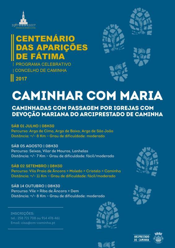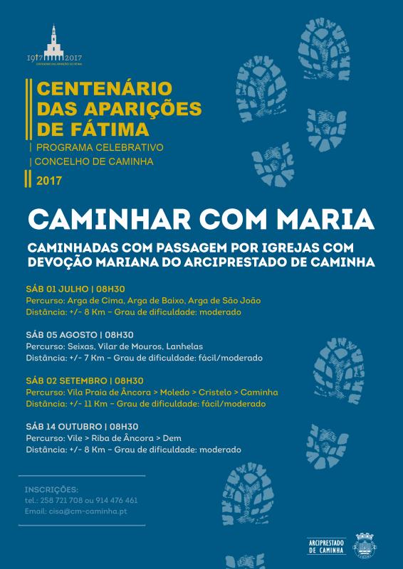 SÁB 05 AGOSTO| 08H30\r\nCAMINHAR COM MARIA\r\nCAMINHADA COM PASSAGEM POR IGREJAS COM DEVOÇÃO MARIANA DO ARCIPRESTADO DE CAMINHA\r\nPrograma Celebrativo do Centenário das Aparições de Fátima