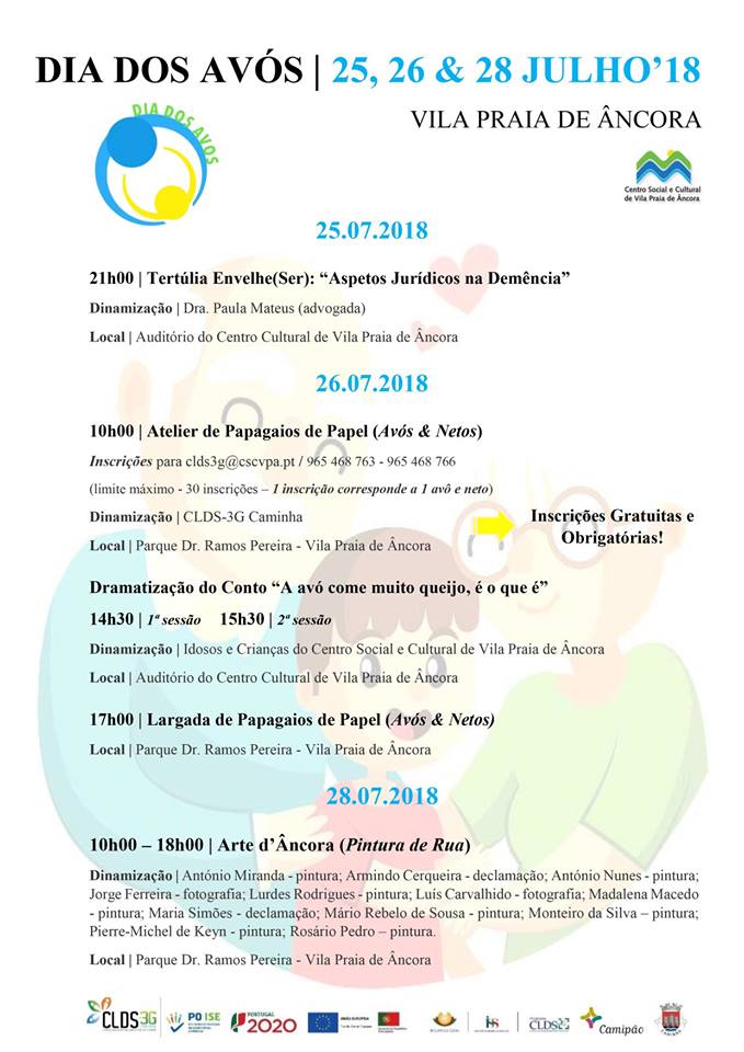 26 de julho é o dia de homenagear os avós. O Centro Social e Cultural de Vila Praia de Âncora – CLDS 3G Caminha, à semelhança dos anos anteriores, irá comemorar o Dia Mundial dos Avós 2018, com o desenvolvimento de atividades nos dias 25, 26 e 28, em Vila Praia de Âncora. Ainda vai a tempo de participar. Inscreva-se.