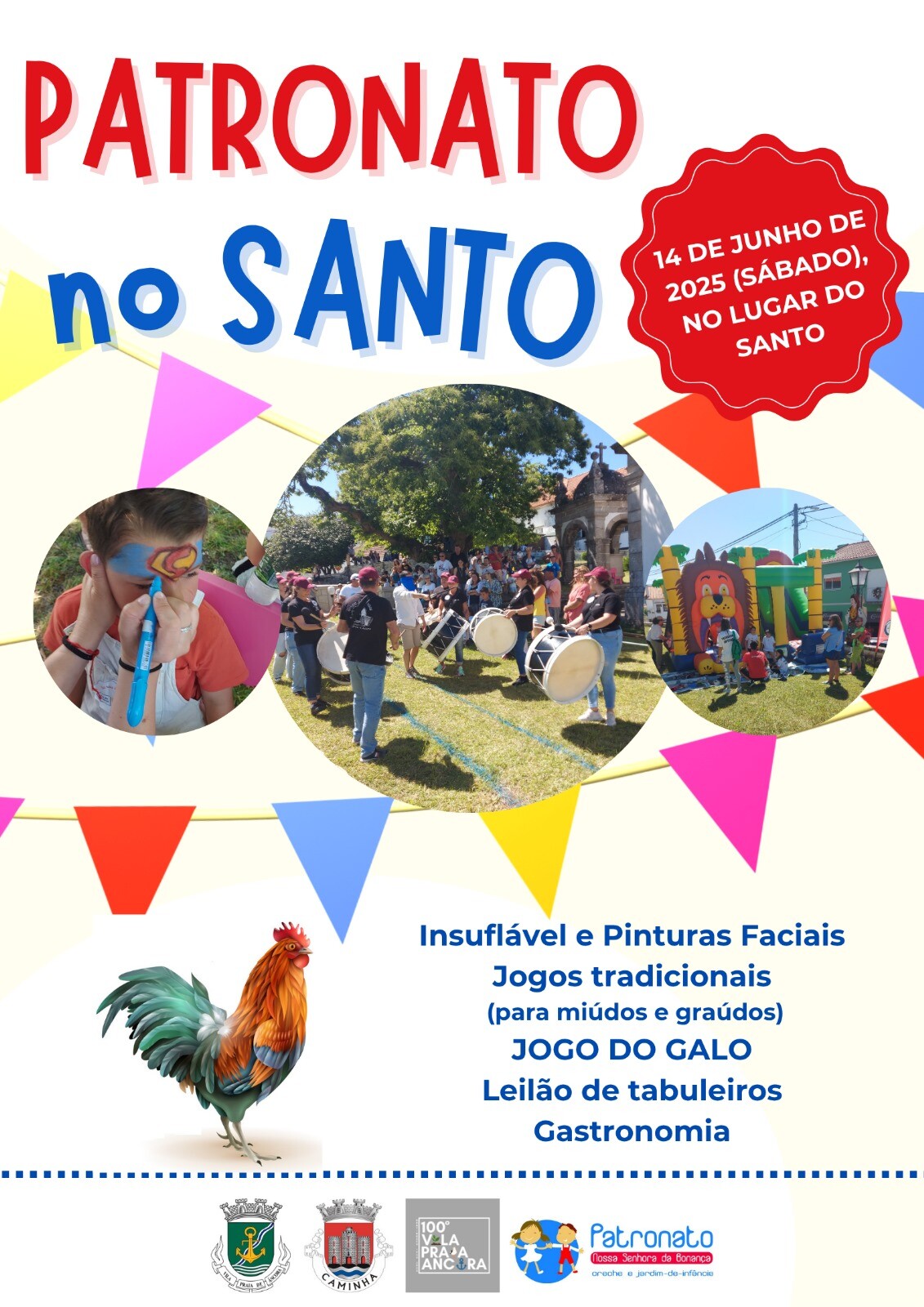 Será um dia muito animado e divertido, com boa gastronomia, animação musical, insuflável, pinturas faciais, jogos tradicionais para pequenos e graúdos, o tradicional Jogo do Galo e o leilão de tabuleiros.