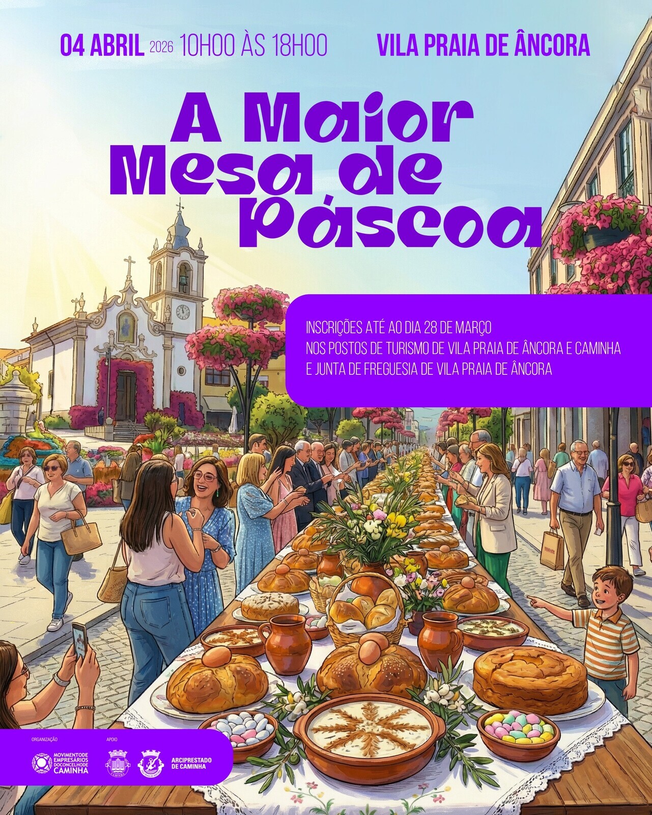 👉A Maior Mesa da Páscoa está de regresso às ruas5 de Outubro e 31 de Janeiro de Vila Praia de Âncora, no dia 4 de abril. Este evento é um retrato da “mesa de Páscoa” do nosso concelho, onde não faltam os doces típicos, como folares da Páscoa, Pão de ló e chocolates, bem como decorações temáticas e artesanato que caracteriza esta quadra.
