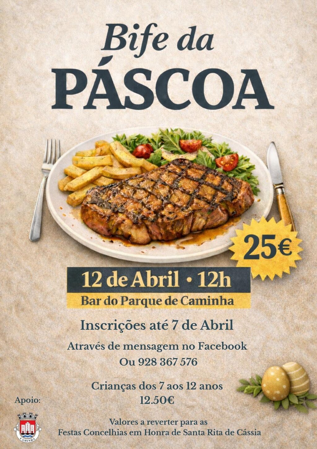 No dia 12 de abril, às 12H00, marcamos encontro no Bar do Parque de Caminha para um almoço especial: o Bife da Páscoa!