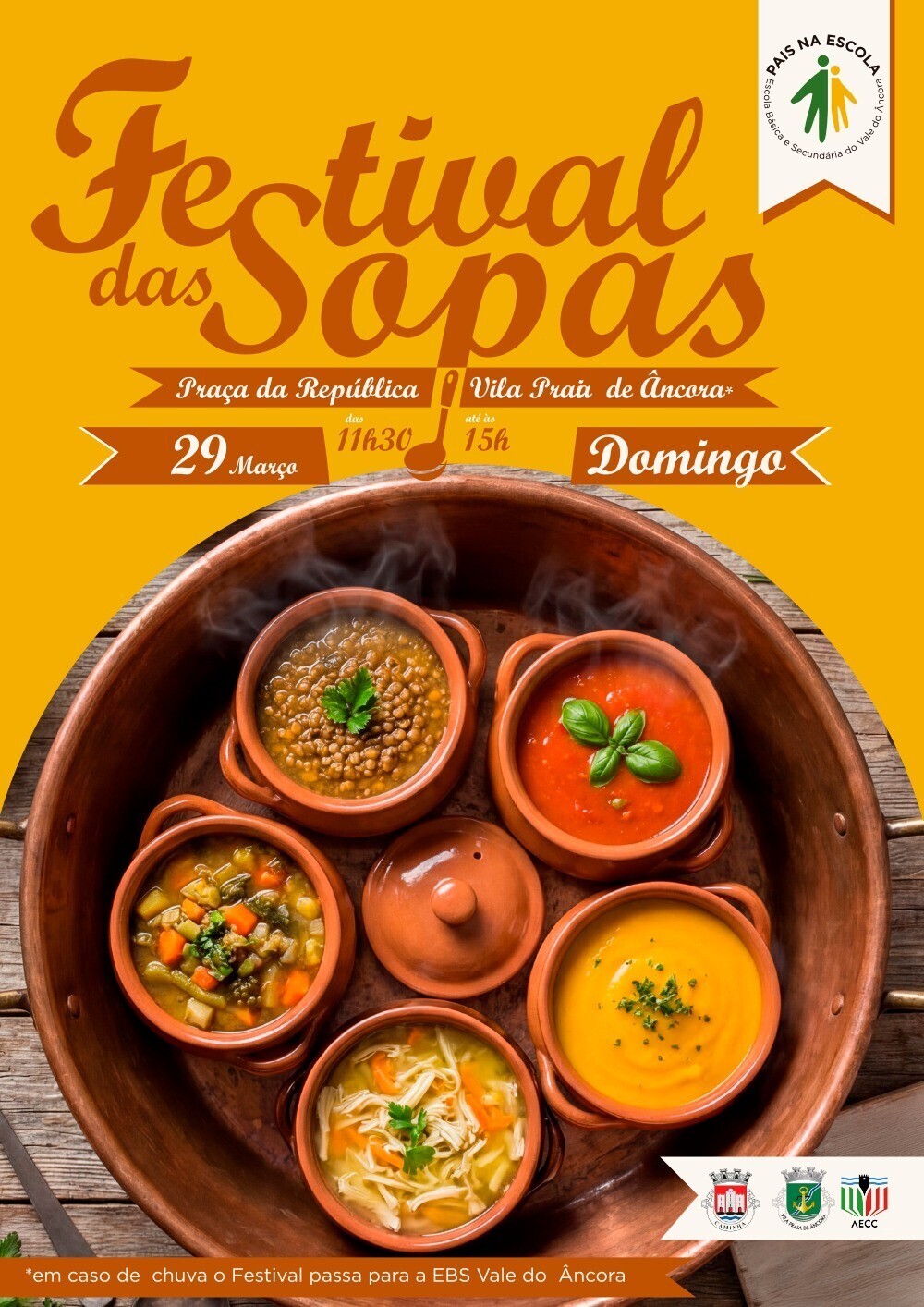 Das 11h30 às 15h00, venha provar as mais variadas sopas deliciosas, feitas pela Associação Pais na Escola.